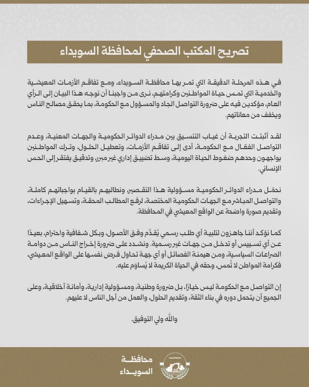 كما حمّل البيان مديري الدوائر الحكومية مسؤولية أي تقصير، داعياً إياهم إلى أداء واجباتهم ومتابعة قضايا المواطنين بشفافية واحترام، وتقديم المطالب إلى الجهات المختصة ضمن الأطر الرسمية، بعيدًا عن التجاذبات أو الاستغلال السياسي.