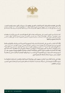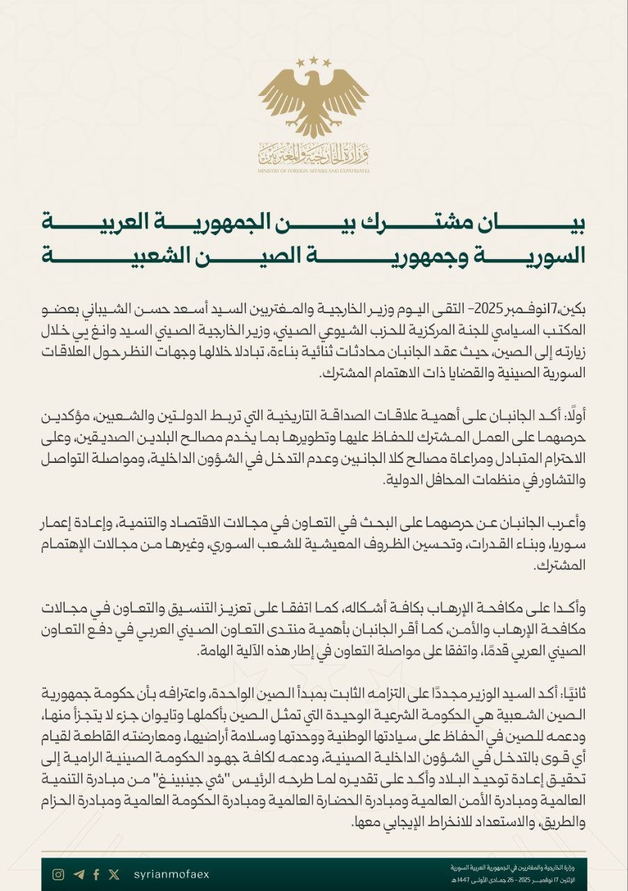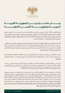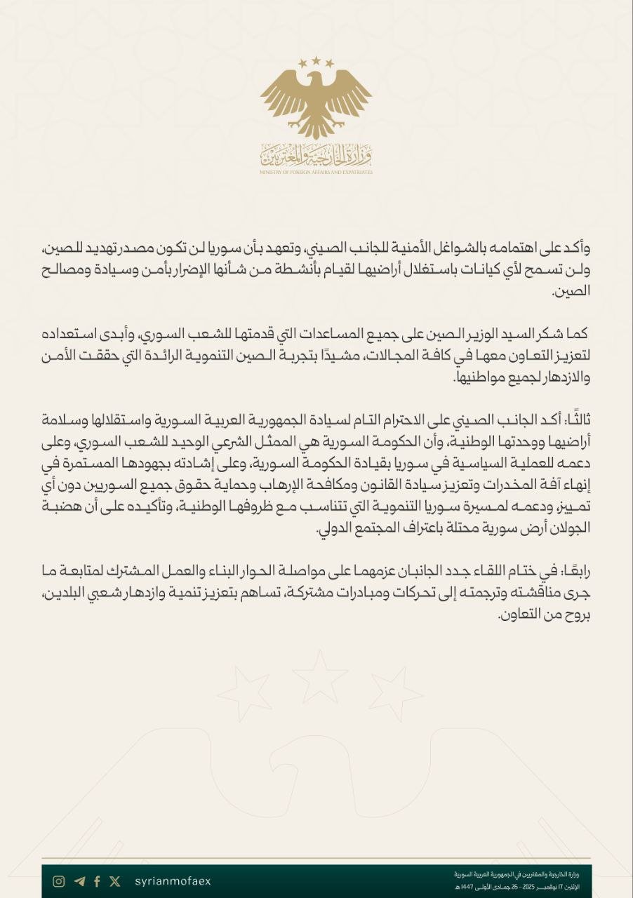 من جهتها، أكدت الصين في البيان احترامها الكامل لإستقلال وسيادة ووحدة أراضي الجمهورية العربية السورية، واعتبرت أن الجولان أرض سورية محتلة، مجددة دعمها للمسار التنموي الوطني في سوريا، واتفاق الجانبين على مواصلة الحوار والعمل المشترك لتحويل ما تم التوافق عليه إلى برامج ومشروعات عملية تخدم مصالح الشعبين الصديقين.
