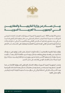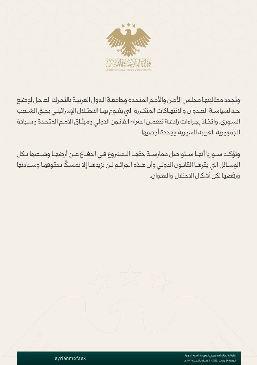 وجدّدت وزارة الخارجية والمغتربين مطالبة مجلس الأمن والأمم المتحدة وجامعة الدول العربية بالتحرك العاجل لوضع حد لسياسة العدوان والانتهاكات المتكررة التي يمارسها الاحتلال الإسرائيلي بحق الشعب السوري، واتخاذ إجراءات رادعة تضمن احترام القانون الدولي وميثاق الأمم المتحدة، وصون سيادة الجمهورية العربية السورية ووحدة أراضيها.