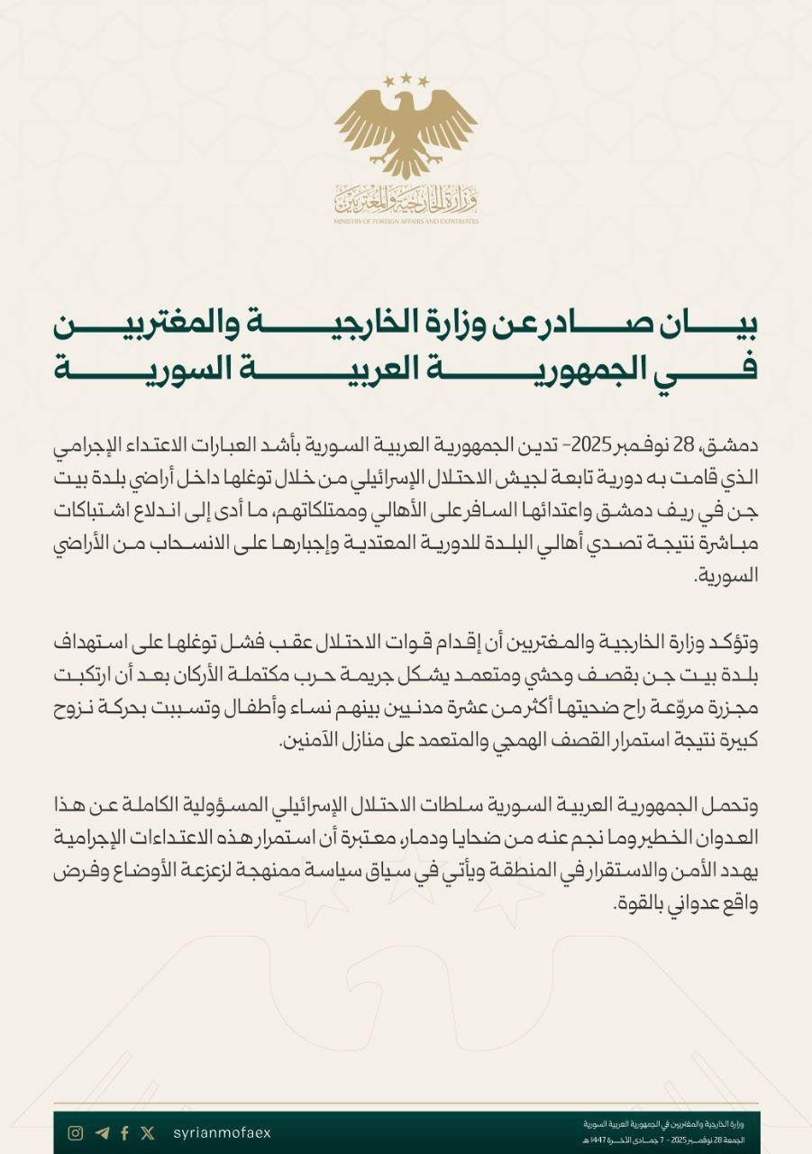 تدين دمشق بأشدّ العبارات العدوان الإسرائيلي على بلدة بيت جن بريف دمشق، والذي بدأ بتوغّل دورية تابعة لجيش الاحتلال داخل أراضي البلدة والاعتداء على الأهالي وممتلكاتهم، ما أدى إلى اندلاع اشتباكات مباشرة بعد تصدي الأهالي للدورية وإجبارها على الانسحاب من داخل الأراضي السورية، وفق بيان صادر عن وزارة الخارجية والمغتربين في الجمهورية العربية السورية اليوم الجمعة 28 تشرين الثاني 2025.