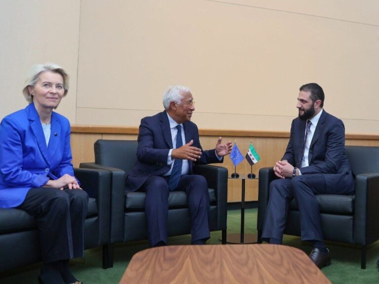 استقبل رئيس الجمهورية العربية السورية أحمد الشرع اليوم الجمعة، في قصر الشعب بدمشق، رئيس المجلس الأوروبي أنطونيو كوستا، ورئيسة المفوضية الأوروبية أورسولا فون دير لاين، والوفد المرافق لهما، وذلك بحضور وزير الخارجية والمغتربين أسعد حسن الشيباني.