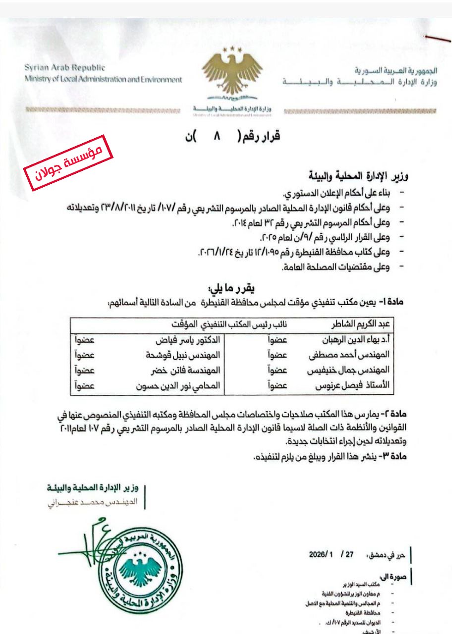 أصدر وزير الإدارة المحلية والبيئة قراراً يقضي بتعيين مكتب تنفيذي مؤقّت لمجلس محافظة القنيطرة، وذلك استناداً إلى أحكام الإعلان الدستوري، وقانون الإدارة المحلية، والقرارات والمراسيم التشريعية الناظمة لعمل المجالس المحلية.