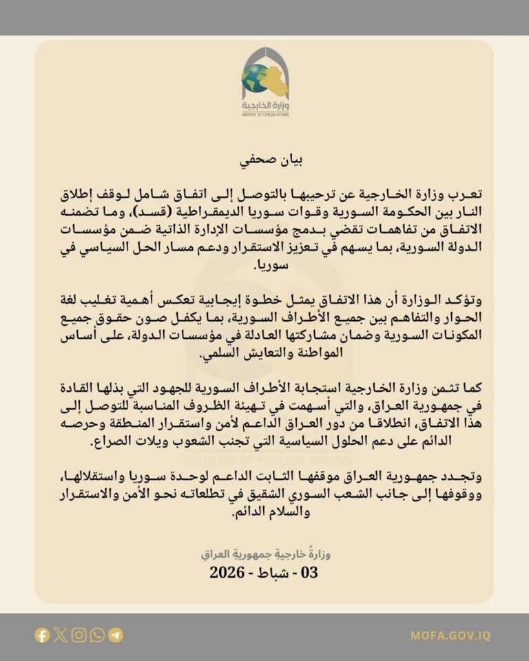رحبت وزارة الخارجية العراقية بالتوصل إلى اتفاق شامل لوقف إطلاق النار بين الحكومة السورية وقوات سوريا الديمقراطية (قسد)، مؤكدة أن الاتفاق يتضمن تفاهمات تقضي بدمج مؤسسات الإدارة الذاتية ضمن مؤسسات الدولة السورية، بما يسهم في تعزيز الاستقرار ودعم مسار الحل السياسي في البلاد.