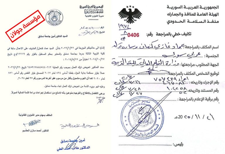 الدكتور عماد كنعان، الذي ترك عمله في كلية التربية بجامعة دمشق منذ عام 2012م رفضاً لأن يكون جزءاً من آلة الاستبداد، فوجئ عند عودته إلى الوطن بعد سقوط النظام بإشعار رسمي يمنعه من السفر، استناداً إلى دعوى قضائية رفعها النظام البائد ضده عام 2014م بتهمة “جرم ترك العمل”. وبين مكاتب الحدود والجامعة، وجد نفسه مضطراً لخوض إجراءات بيروقراطية مرهقة، ودفع غرامات مالية باهظة، وإتمام براءات ذمة متشعبة، ليتمكن في النهاية من تقديم استقالته رسمياً.