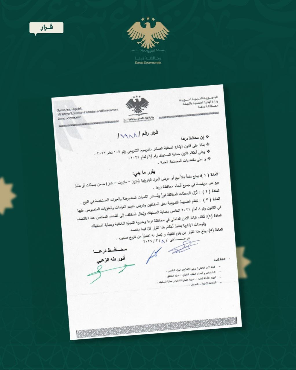 وكلف قرار المحافظ، قيادة الأمن الداخلي في درعا ومديرية التجارة الداخلية وحماية المستهلك والوحدات الإدارية بتنفيذ أحكام هذا القرار.