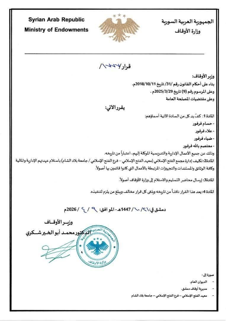 أصدرت وزارة الأوقاف السورية قراراً يقضي بكفّ يد أربعة من العاملين في معهد الفتح الإسلامي، فرع الفتح (جامعة بلاد الشام)، استناداً إلى أحكام القوانين والأنظمة النافذة، وفي إطار ما وصفته بـ”مقتضيات المصلحة العامة”.